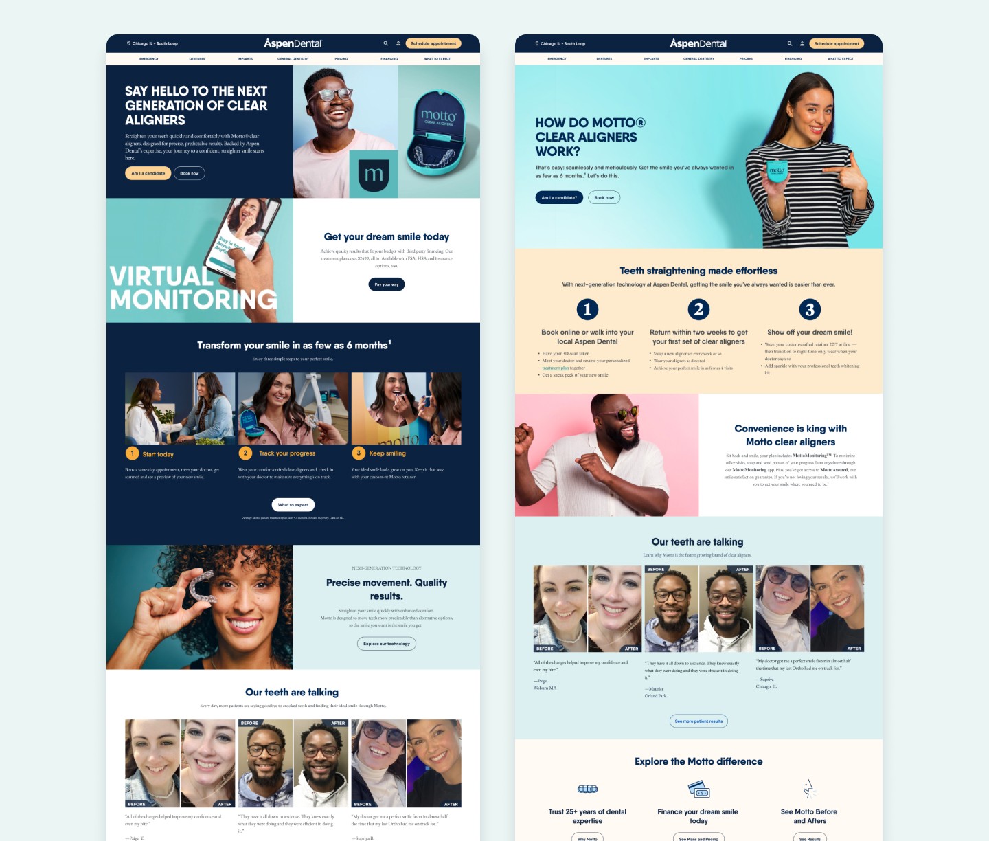Designed landing pages and marketing campaigns for Motto, Aspen Dental’s direct-to-consumer orthodontic brand. Developed a comprehensive design system for Motto’s CRM, ensuring visual consistency and scalability across customer communications. Focused on clean, conversion-driven design, collaborating with marketing and development teams to create engaging, high-impact visuals that enhanced user experience and drove lead generation.